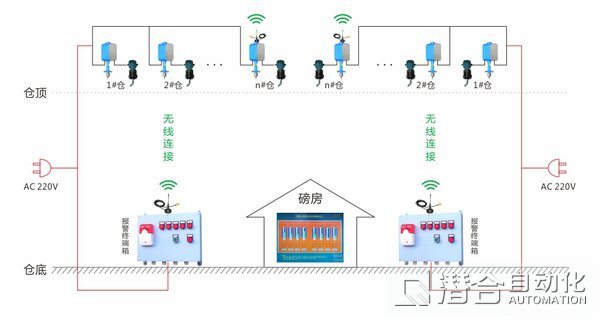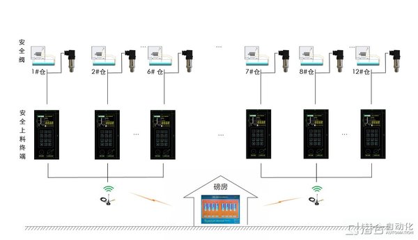 上料口側(cè):上料安全控制終端、電動蝶閥,每個料倉1個,各個終端通過網(wǎng)絡(luò)連接。