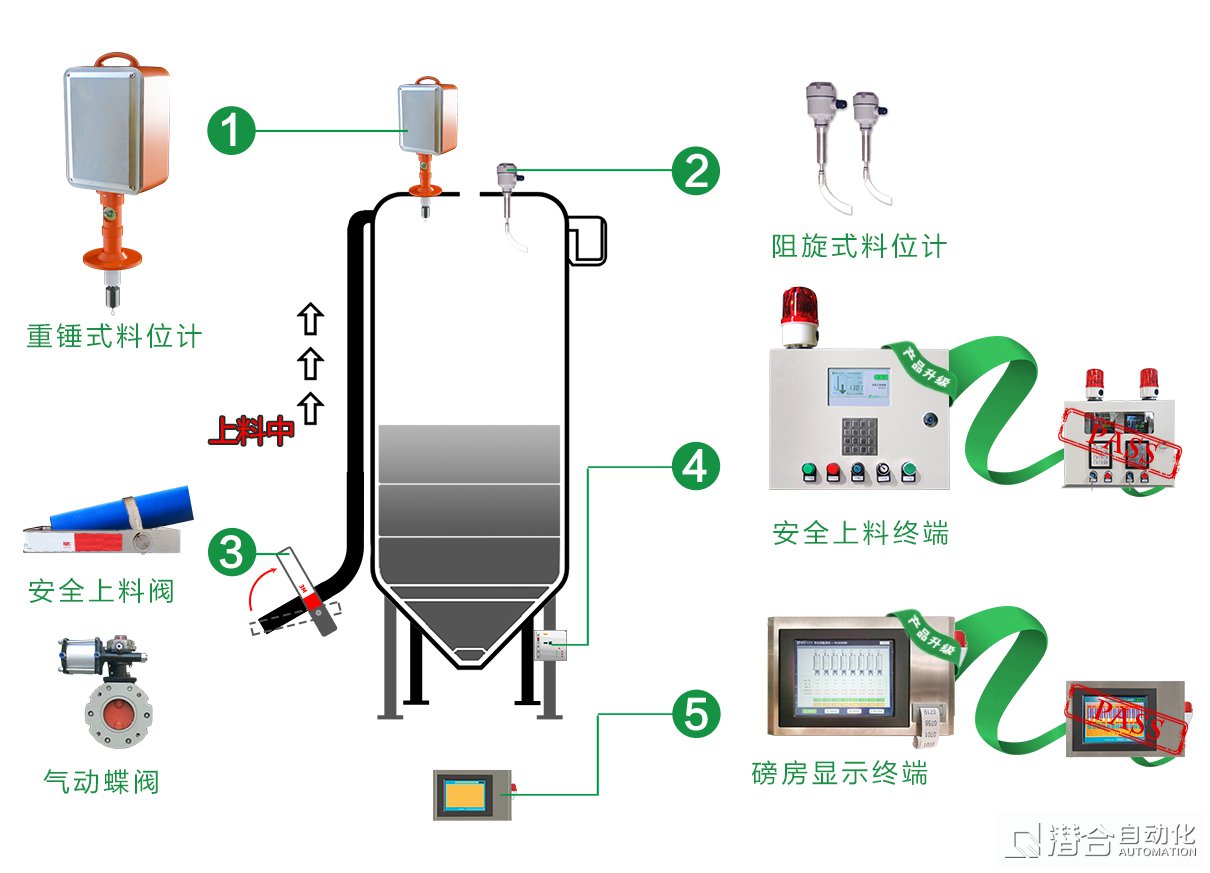從上料、配料、計(jì)量、加料到攪拌出料都會(huì)出現(xiàn)一定程度的粉塵污染。潛合自動(dòng)化通過安裝于倉(cāng)頂?shù)闹劐N式料位計(jì)探測(cè)筒倉(cāng)內(nèi)料面位置,獲取上空值,并通過料倉(cāng)有效高度、錐體高度、堆積密度、堆積密度算法獲取倉(cāng)內(nèi)物料存量,對(duì)倉(cāng)內(nèi)存量有預(yù)期,配合報(bào)警系統(tǒng),方法大大降低了粉塵對(duì)環(huán)境的污染。