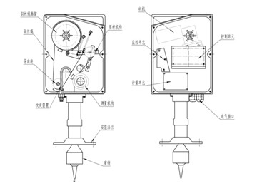 重錘式料位計的主要部件有:重錘、安裝法蘭、測量機構(gòu)、吹灰裝置、導(dǎo)向輪、鋼絲繩、鋼絲繩卷筒、擺桿機構(gòu)、控制單元、電機、測控單元、計量單元和電氣接口。