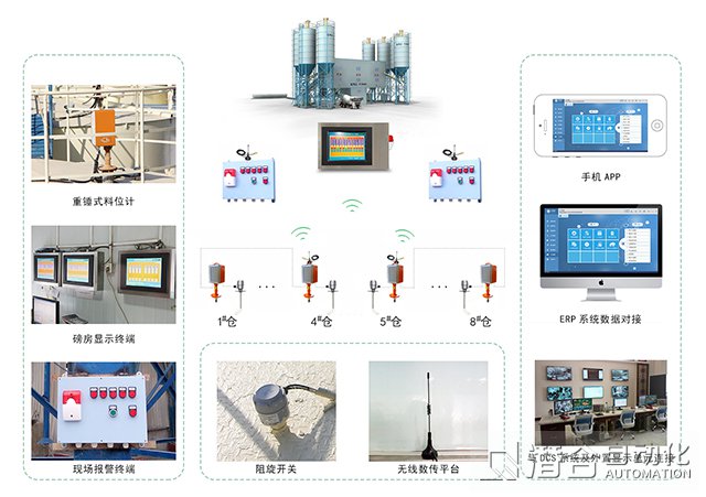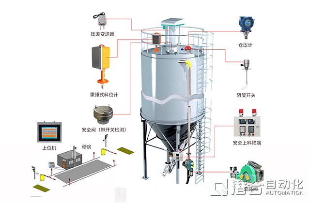 從上料、配料、計(jì)量、加料到攪拌出料都會(huì)出現(xiàn)一定程度的粉塵污染。潛合自動(dòng)化通過安裝于倉頂?shù)闹劐N式料位計(jì)探測(cè)筒倉內(nèi)料面位置,獲取上空值,并通過料倉有效高度、錐體高度、堆積密度、堆積密度算法獲取倉內(nèi)物料存量,對(duì)倉內(nèi)存量有預(yù)期,配合報(bào)警系統(tǒng),方法大大降低了粉塵對(duì)環(huán)境的污染。
